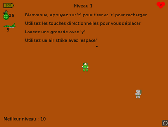 Dernière version : Du fait du prolongement de la Jam, ajout du sang lors de l'impact des balles et ajout de deux armes : grenades et air strikes. Création d'un fichier texte au premier lancement du jeu afin de sauvegarder le plus haut niveau atteint.